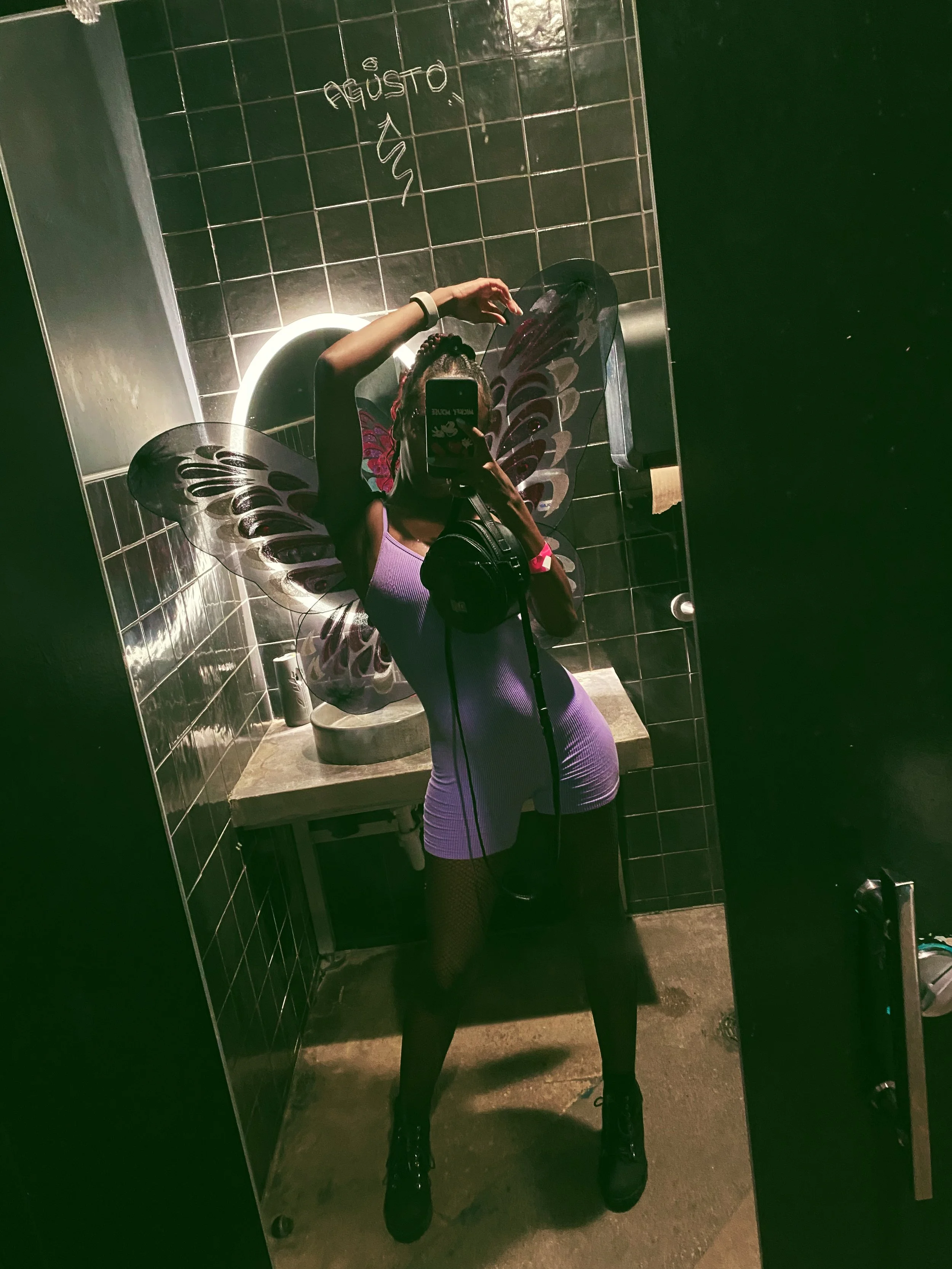 My second costume was a butterfly faerie costume that I put together from my favorite lilac bodysuit, bought some butterfly wings and face jewels from PARTY CITY, and paired with some black fishnet tights! I think I might start shopping at PARTY CITY for my regular clothes! I wore this costume to the Roosevelt show at The Studio at the Factory.